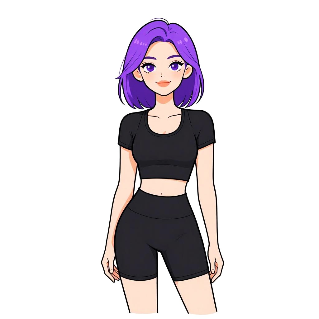 Woman with pretty face and pretty hair. smiling Woman, sporty chic, black coordinated activewear set, crop top with short sleeves and a round neckline, matching high-waisted cycling shorts, minimalistic design, white background. --sref 1461