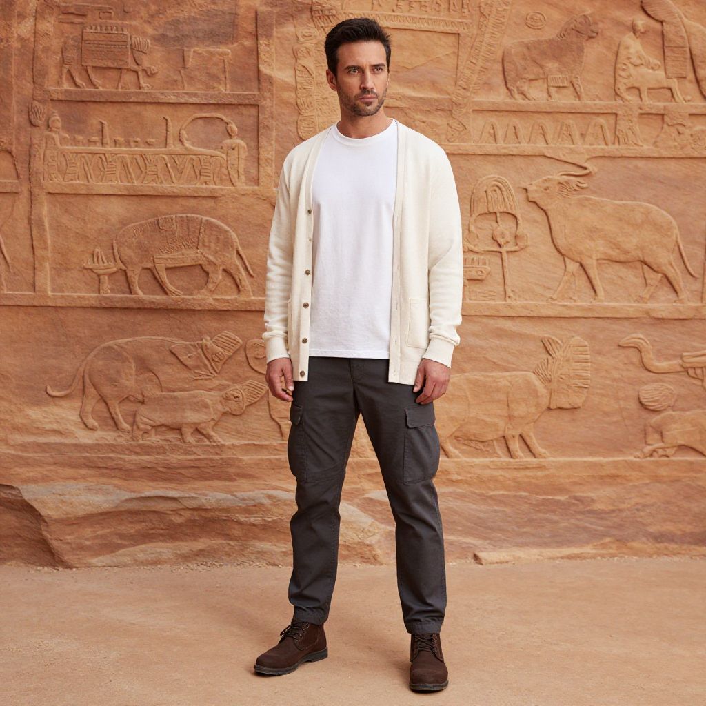 A man, cream long sleeve tee, dark gray utility pants, chocolate brown chukka boots, soft cotton cardigan, modern fit, ancient sandstone cliffs, intricate carvings of animals, vibrant desert hues, camera obscura style, contemplative expression Man has masculine face and piercing eyes