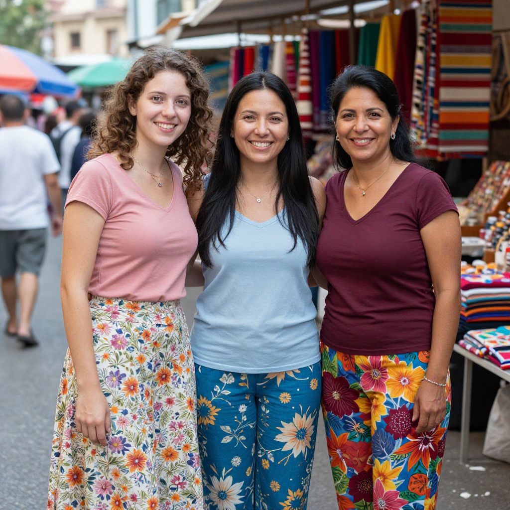Photograph of a bustling outdoor market. A diverse group of six people, three women and three men, are standing in a line, examining colorful photographs displayed on a long table. The people have varied ethnicities and ages, with one older man with gray hair and a beard in the center. They are dressed in casual clothing, including jeans, t-shirts, and a maroon hoodie. The background features market stalls with blue and orange canopies, and string lights add a warm glow. The scene is lively with vibrant colors and a sense of community.