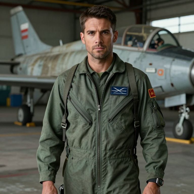 Photograph of a serious-looking, attractive, white man with short brown hair and a trimmed beard, standing in front of a military aircraft in a hangar. He is wearing a dark green flight suit with black suspenders, a blue and white patch on the left chest, and a red patch on the right arm. The flight suit has a zip-up front and a slightly worn texture. The background features a weathered gray military jet with visible red and white markings on the tail. The hangar is dimly lit with concrete floors and industrial lighting.