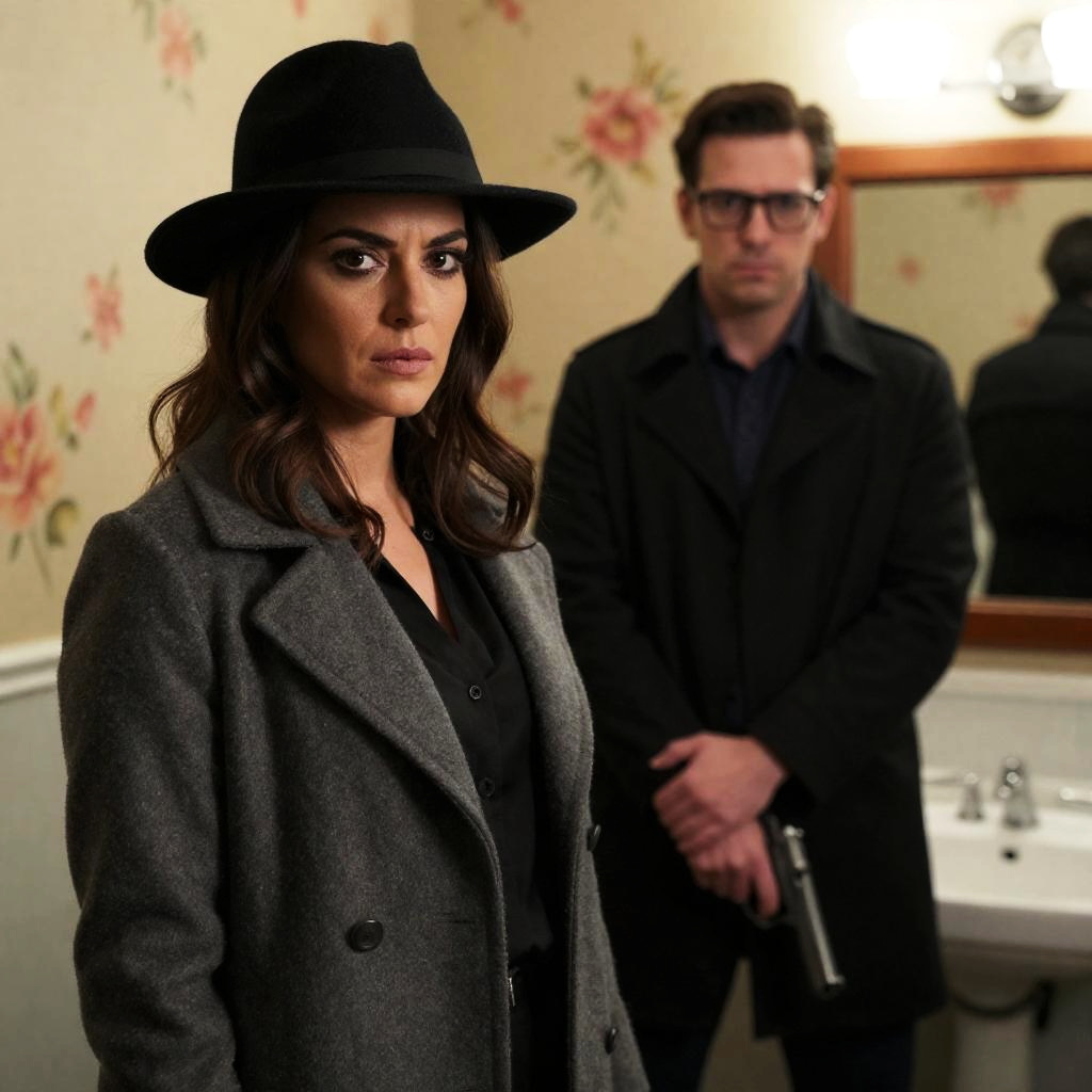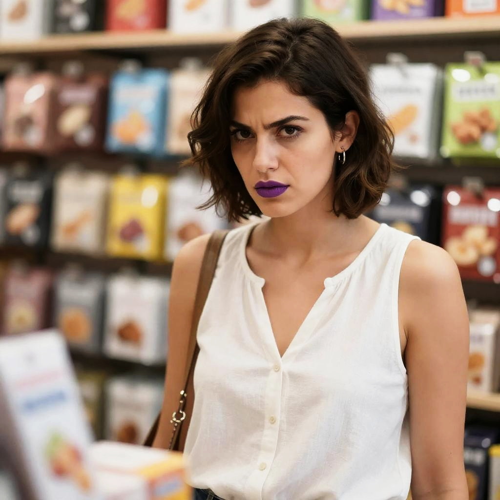 Woman with long black hair, brown leather jacket, black pants, holding pink gift box and blue gift box, sitting in front of white Christmas tree with green and purple ornaments. Man in flat cap and green jacket standing behind her. Other shoppers in background. Gift boxes and white shelves on left. Bright store interior. Woman's intense expression, man's neutral expression.