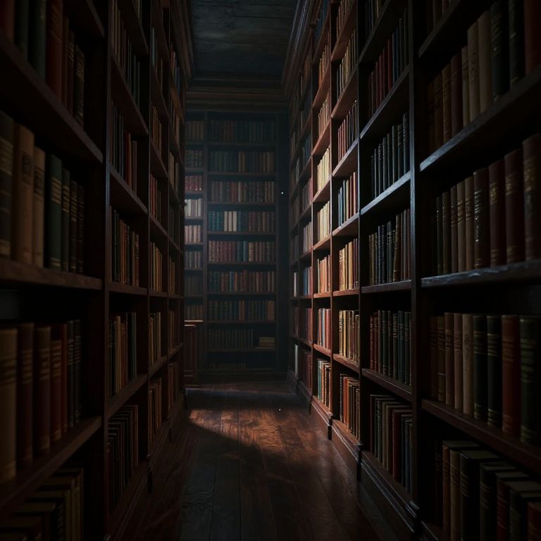 An atmospheric digital rendering of a dimly lit library corridor, bathed in dramatic lighting, where towering shelves of vintage books stretch into the shadows, evoking a sense of forgotten stories and liquid memories.