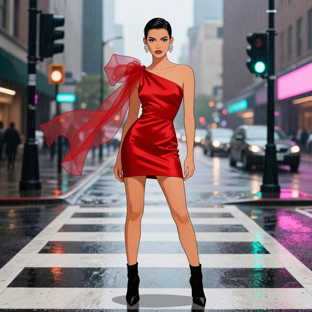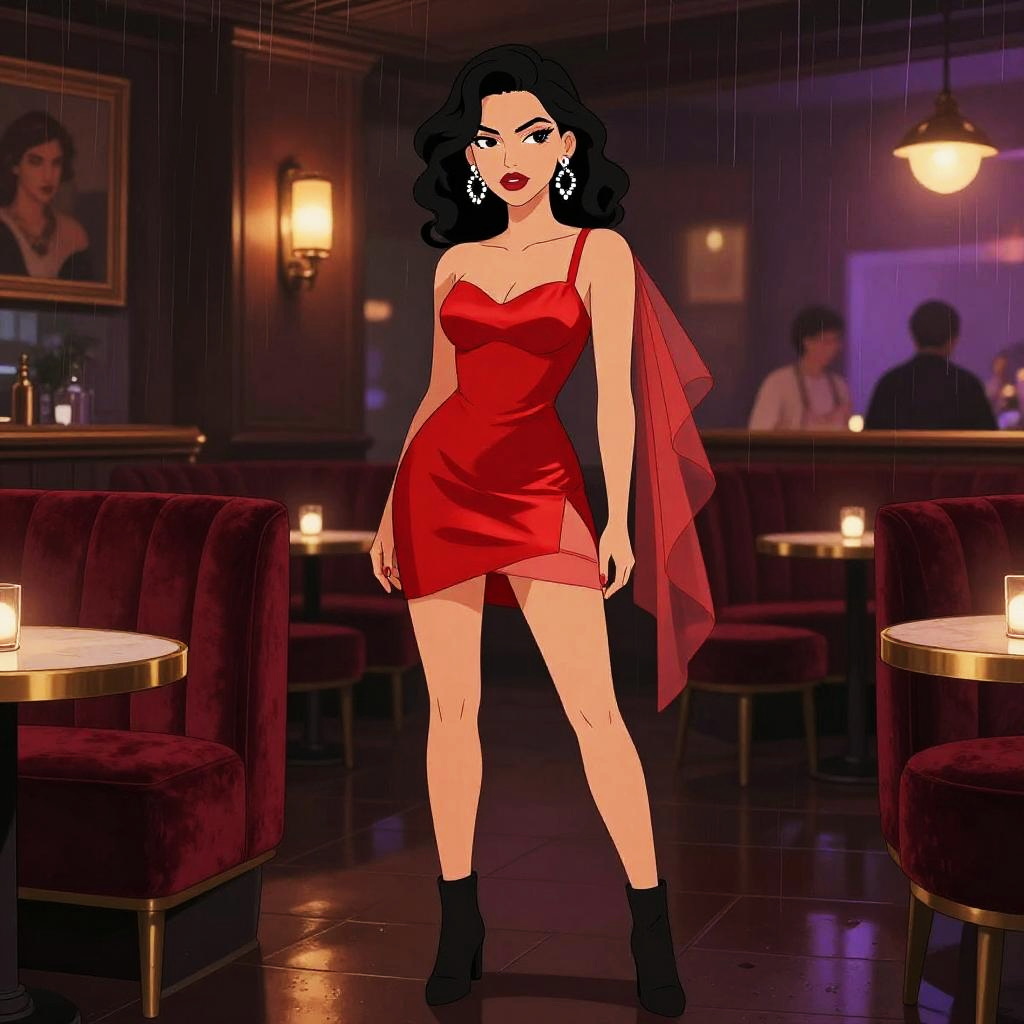 Chic underground cocktail lounge with velvet accents, woman with dark wavy hair and mysterious gaze. Bold red smooth satin bodycon mini dress with asymmetrical hem and cut-out sides; sheer organza scarf cascading down one shoulder; gleaming statement earrings; ankle boots; edgy vibe. dim warm amber with discreet violet undertones, rain-slick reflections, cinematic haze, urban fashion editorial energy, full-body stance, crisp detail, tactile fabrics, color-driven composition, rebellious yet refined mood. --sref 1467