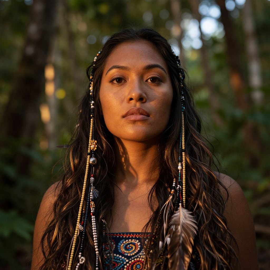 Photograph of a young woman with medium brown skin and long, wavy black hair adorned with beaded braids and feathers. She wears a colorful beaded top with a circular pattern. Her face is serious, with dark brown eyes and slightly parted lips. The background is a blurred forest with green foliage and dappled sunlight. The image has a warm, golden light highlighting her face, creating a natural, earthy feel. The texture of her hair and the beads contrasts with the soft, green forest backdrop.