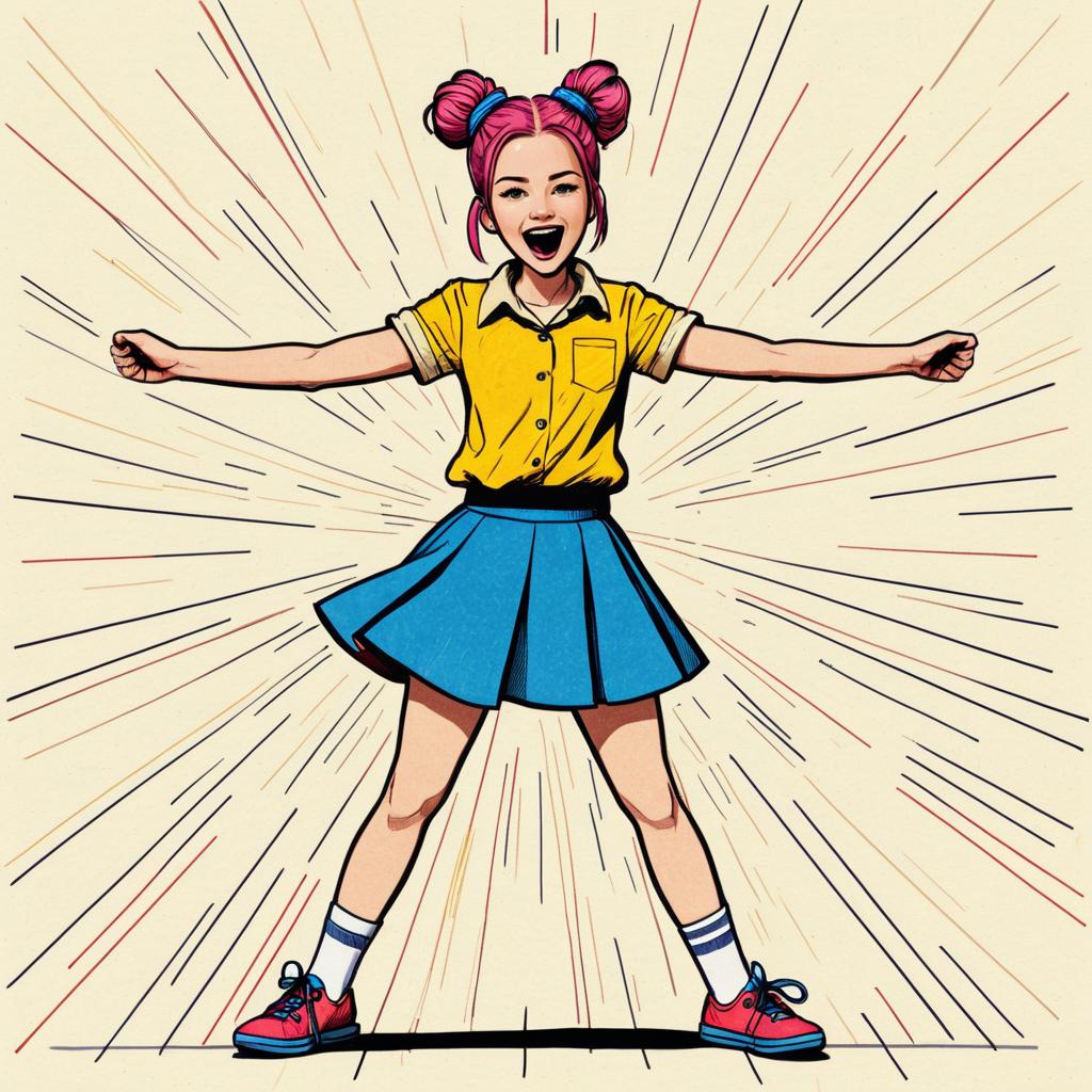 Illustration of an energetic young girl with pink hair styled in two buns secured by blue hair ties. She is wearing a yellow short-sleeve shirt with a collar, a blue pleated skirt, white socks with blue stripes, and red sneakers. The background is plain light-colored with dynamic radiating lines emphasizing her joyful pose with arms wide open. Rendered in a vibrant comic sketch style with bright and warm colors.