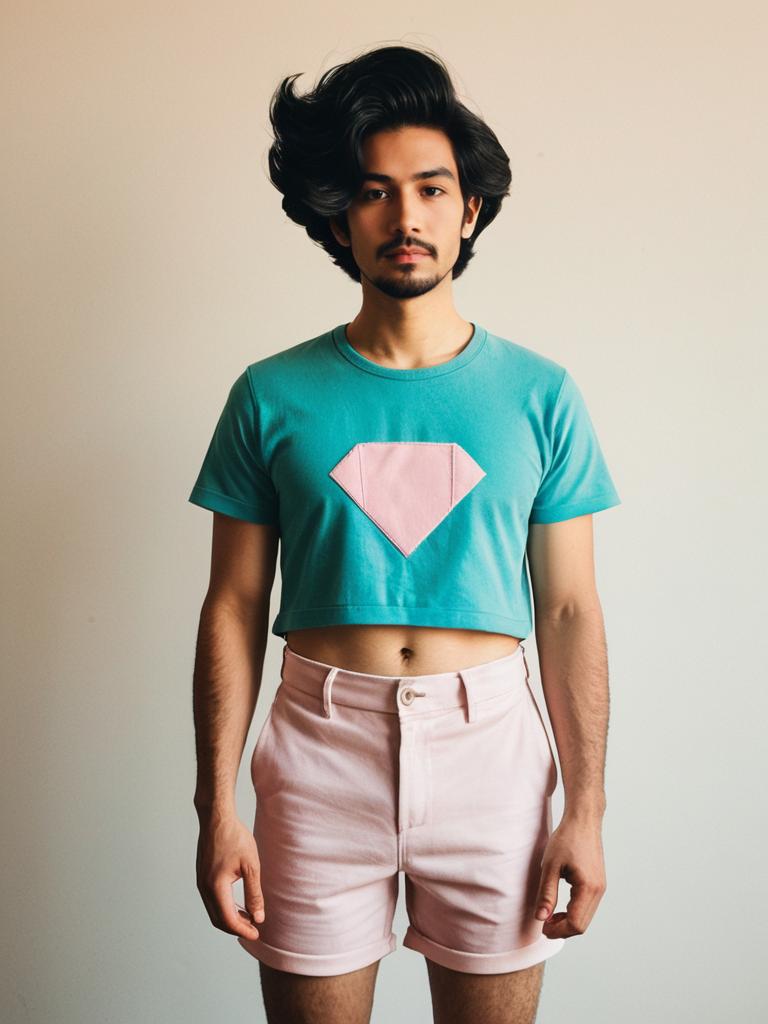 Portrait of a young man wearing a Steven Universe cosplay costume, consisting of a turquoise crop top with a pink diamond emblem and light pink shorts. The man has medium skin tone, dark voluminous hair, and a trimmed beard, standing against a plain neutral background.
