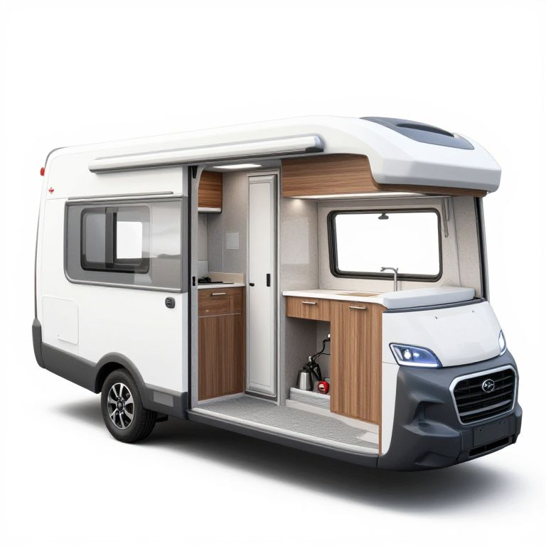 Photorealistic CGI of a modern, white camper van with open interior, featuring wooden accents, compact kitchenette, fridge, and storage compartment.