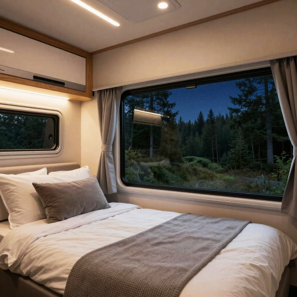 Cutaway illustration of a Hymer camper showing off its advanced interior layout including sleeping areas, kitchen, and bathroom, with detailed mechanical components visible, rendered in a clean and technical style highlighting innovative motorhome engineering.