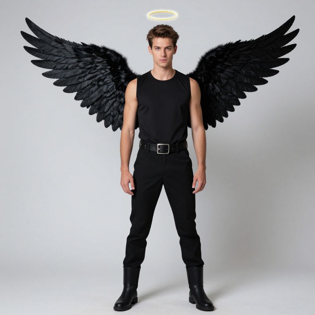 Cupid halloween costume man, halo, 1boy, solo, male focus, wings, angel, full body, angel wings, cape, brown hair, standing, black footwear, boots, realistic, looking at viewer, belt
