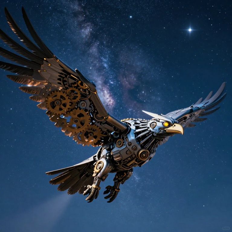 An awe-inspiring digital art piece showcases a colossal mechanical avian soaring through a vivid starlit night sky. The creature's wings, composed of intricate gears and cogs, gracefully slice through the air as its glowing eyes reflect the celestial bodies above. From an unique perspective, the viewer gazes up at this technological marvel, capturing both the grandeur of its high-tech design and the raw beauty of the cosmos it traverses. This visually captivating tableau evokes a sense of wonder and reverence for nature's mysteries by seamlessly blending innovation with natural splendor.