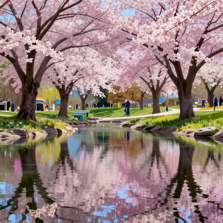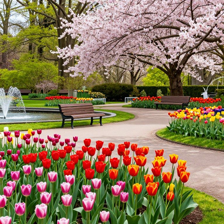 Nikolaev botanical garden in spring bloom, vibrant tulips and cherry blossoms in full color, serene walking paths with benches and fountains, sunlight dappling through lush greenery, butterflies and birds adding life to the tranquil natural setting