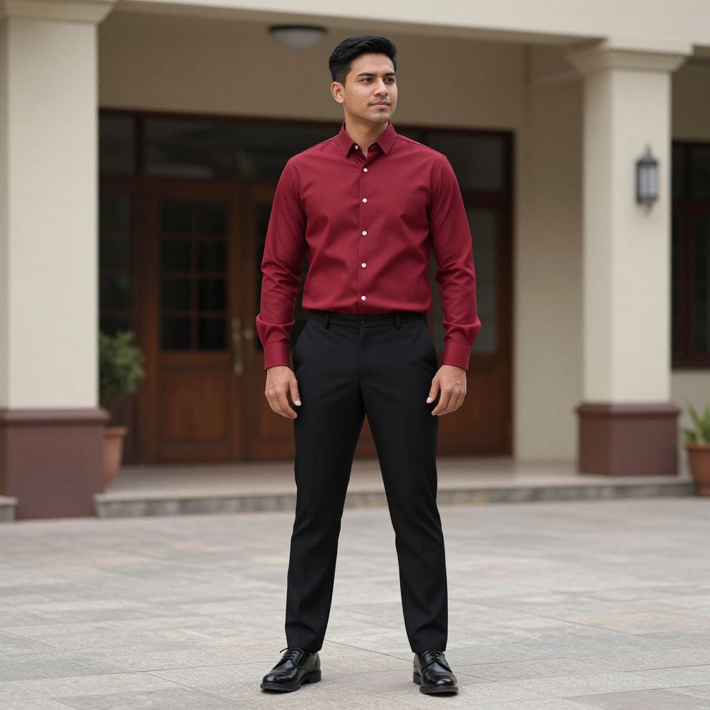 Photograph of a young man standing in front of a building with beige walls and dark brown double doors. He has short black hair, a clean-shaven face, and a light olive skin tone. He is wearing a long-sleeved, button-up red shirt, black dress pants, and black leather shoes. His shirt is neatly tucked in, and he stands with a confident posture. The background includes two potted plants on either side of the door and a small framed picture on the right wall. The ground is tiled in a light gray pattern.