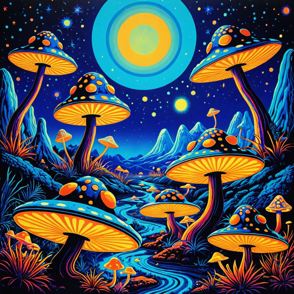 Vintage 70s black light poster of psychedelic frogs, wearing tie-dye hats, alien landscape, UFO flying saucers, psilocybin cubensis mushrooms, vibrant trippy colors, radiant amber and indigo, abstract fluid shapes
