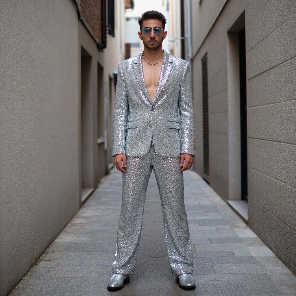 "Man Sequin Outfit, man in a shiny silver suit standing in a narrow alleyway"