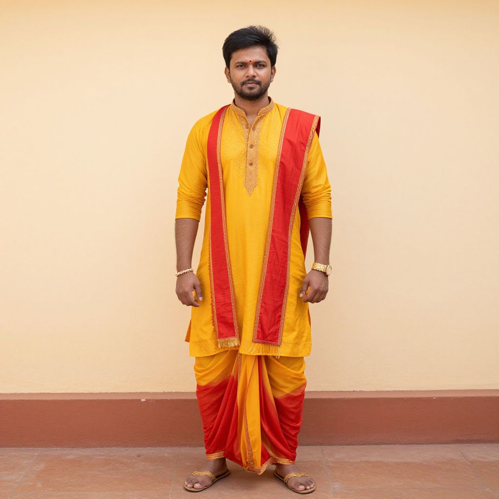 "South Indian Dhoti Kurta Wedding, a man in a yellow and red outfit standing in front of a wall"