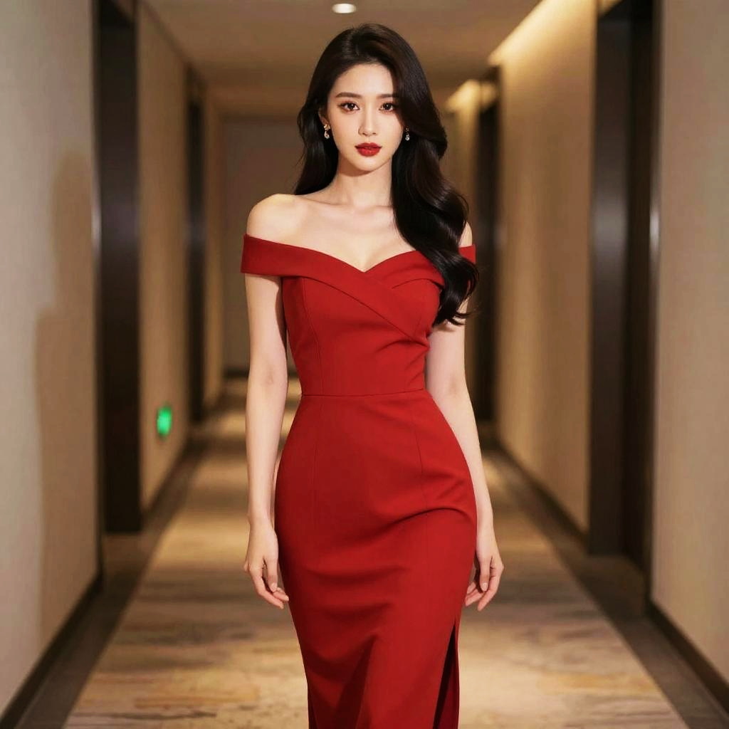 Expensive Black Dress, a woman in a black dress standing in a hallway
