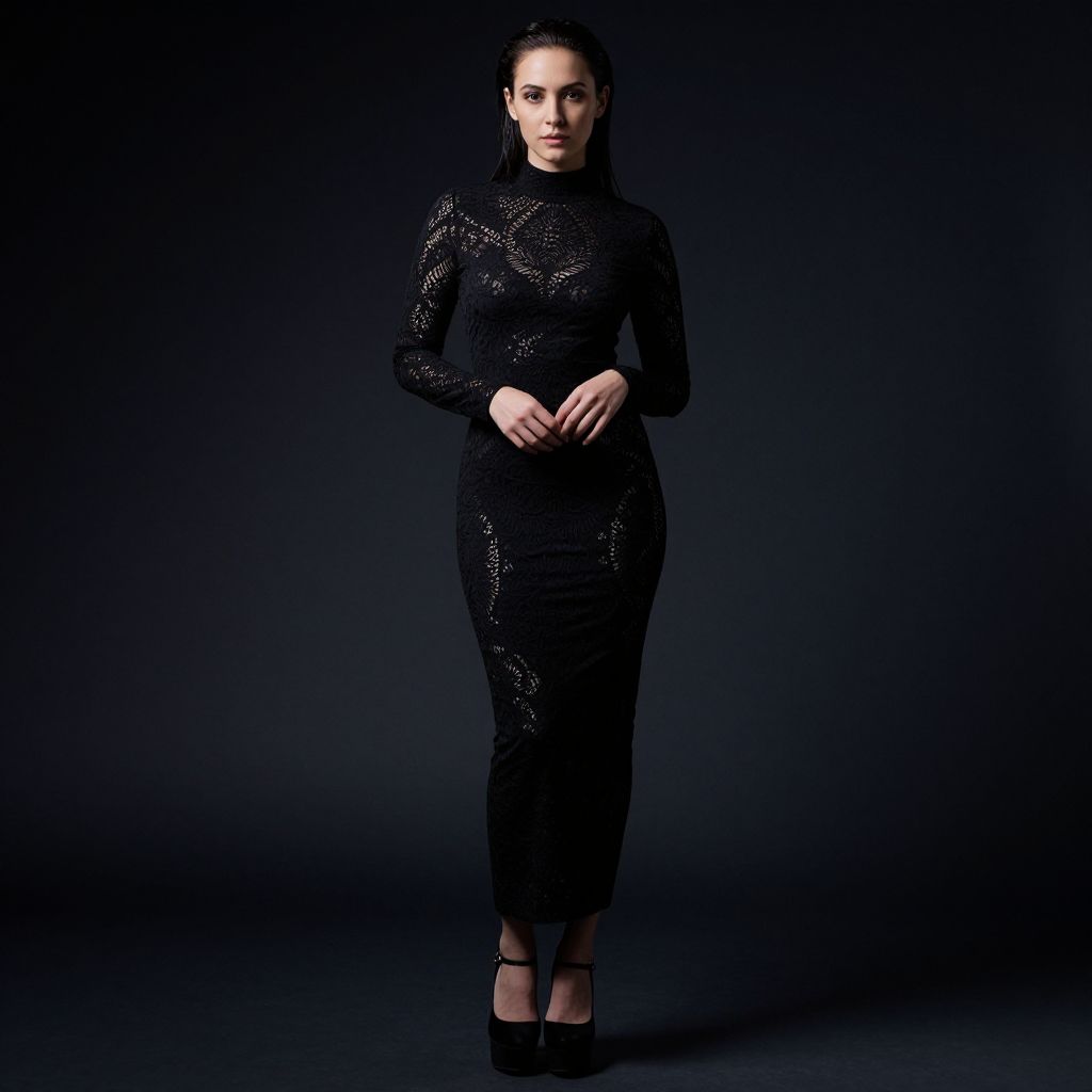 Photograph of a woman standing against a dark, gradient background. She has wet, dark hair and is wearing a black, long-sleeve, patterned dress with a high neckline and a fitted silhouette. Her hands are gently clasped in front of her. She stands on black, platform heels. The lighting creates a subtle glow on her face and dress, emphasizing the intricate patterns.