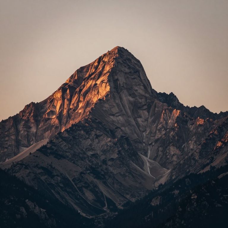 Photograph of a rugged mountain peak bathed in warm sunset light, with dark shadows and a clear, pale sky background.