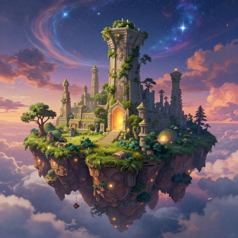 Fantasy floating island surrounded by flying mythical creatures, towering castles with spires, sparkling waterfalls falling into clouds, colorful enchanted flora, intricate fantasy art style