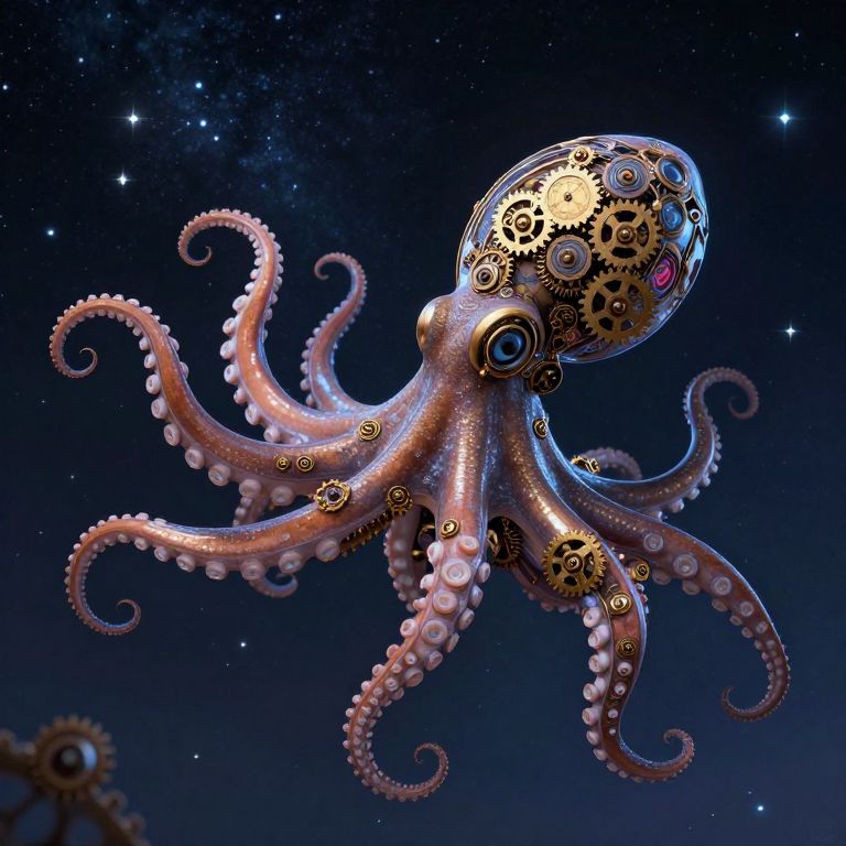 In a mesmerizing steampunk-inspired digital artwork, a celestial clockwork octopus adorned with intricate gears and mechanical details gracefully maneuvers its tentacles against a starry night sky, symbolizing the fusion of cosmic wonder and industrial craftsmanship.