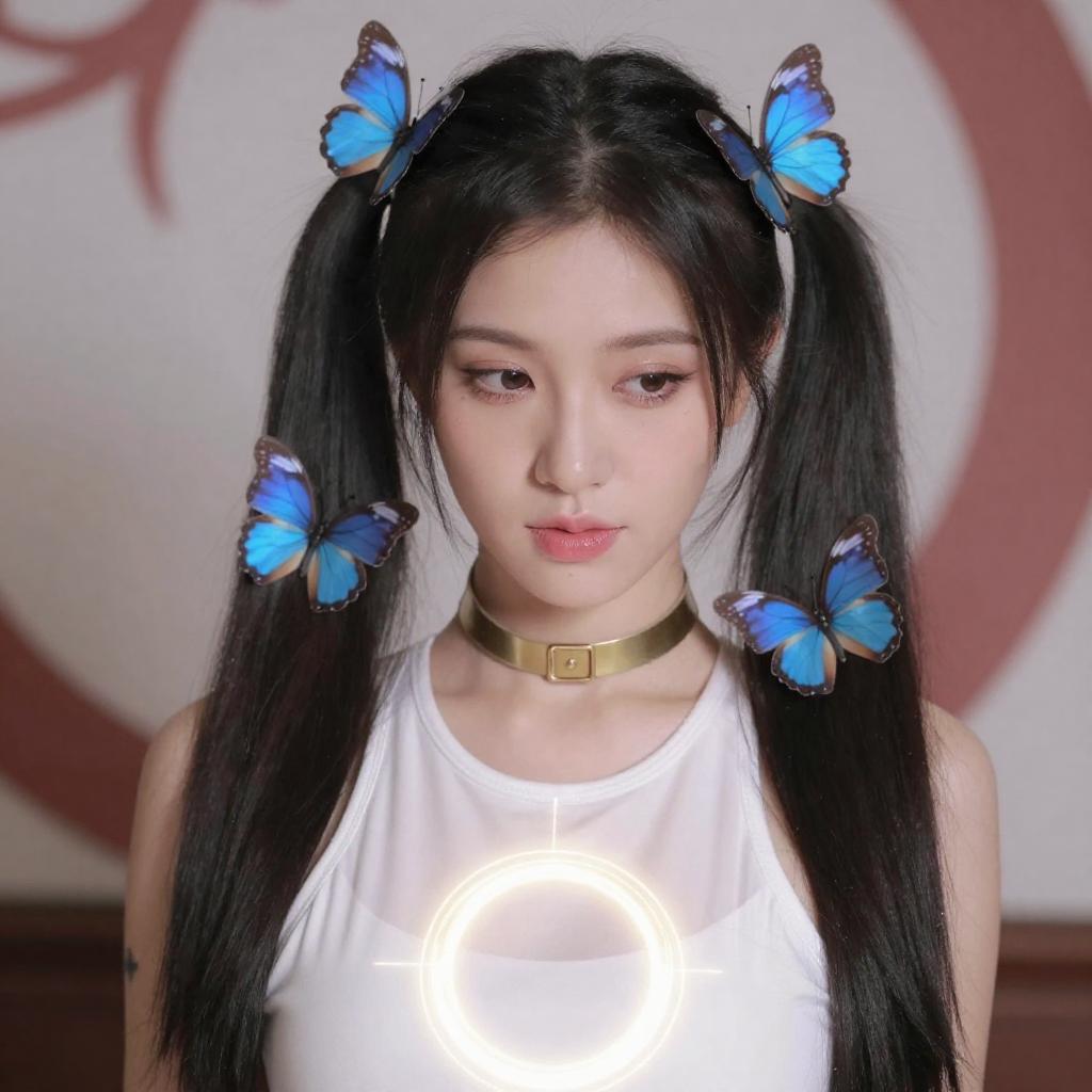 Photograph of an Asian woman with long black hair in twin ponytails, wearing a white sleeveless top with a gold choker. She has fair skin, red lipstick, and large brown eyes, looking directly at the camera. The background is brightly lit, creating a halo effect around her.