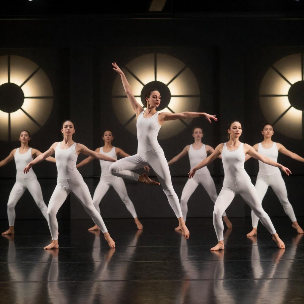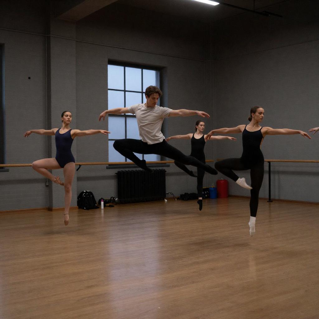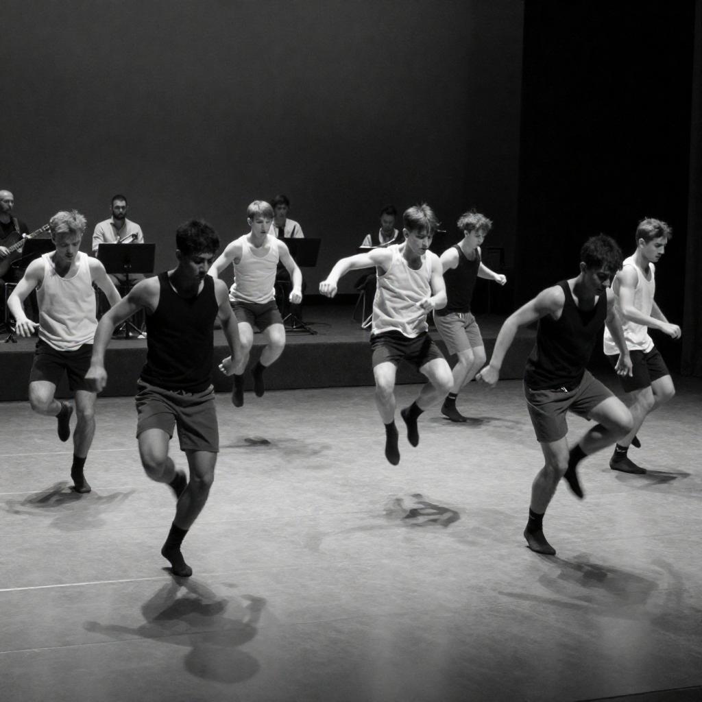 Photograph of a diverse dance group performing in a brightly lit, industrial-style studio with large windows. Dancers, wearing casual clothes in various colors, jump and swing their arms energetically. The polished wooden floor reflects their movements. The background includes a row of musicians playing instruments. The image has a dynamic, lively atmosphere.