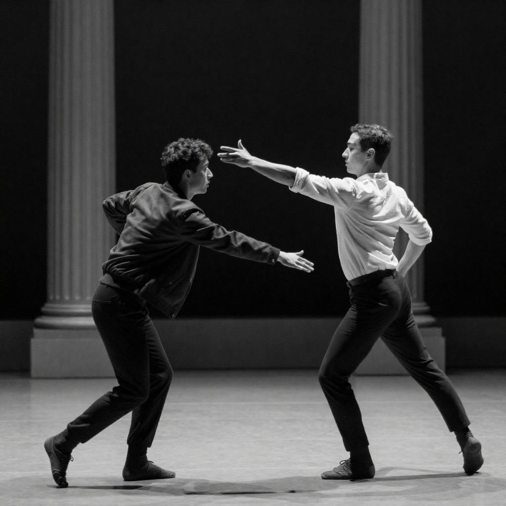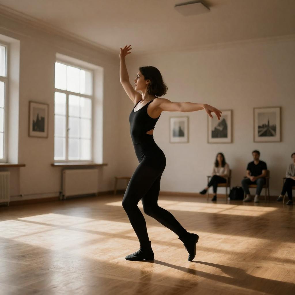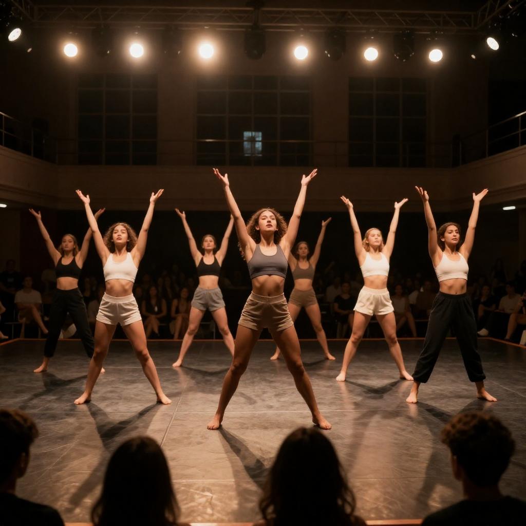 Photograph of a diverse dance group performing in a brightly lit, industrial-style studio with large windows. Dancers, wearing casual clothes in various colors, jump and swing their arms energetically. The polished wooden floor reflects their movements. The background includes a row of musicians playing instruments. The image has a dynamic, lively atmosphere.