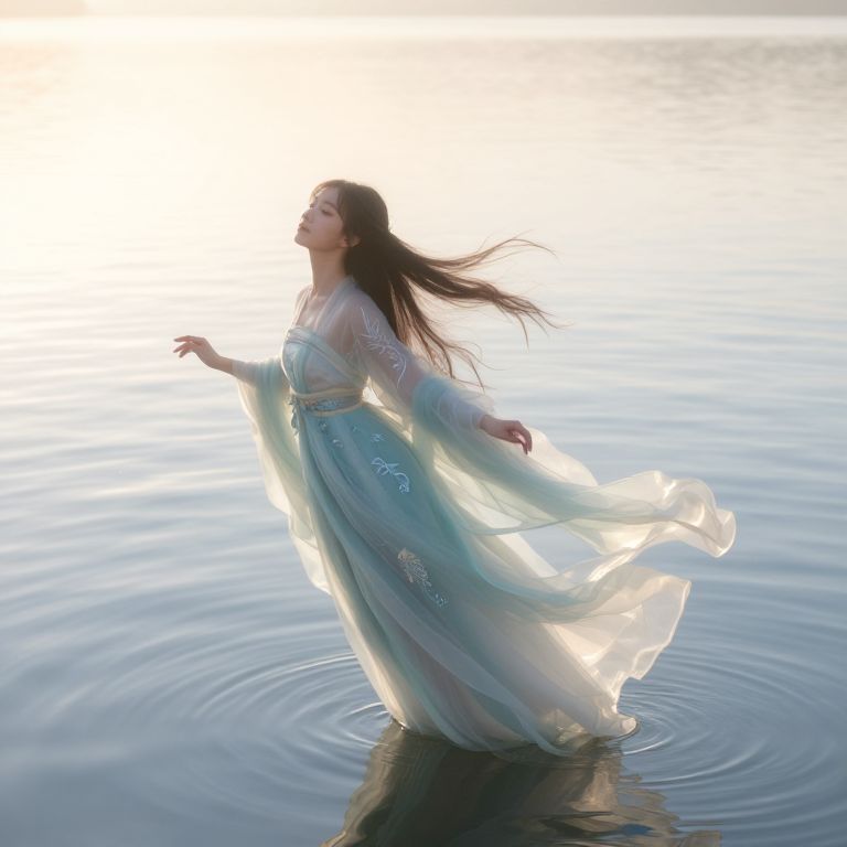 Photograph of a serene woman with long brown hair, in a flowing, translucent blue dress, standing in calm, rippling water, bathed in