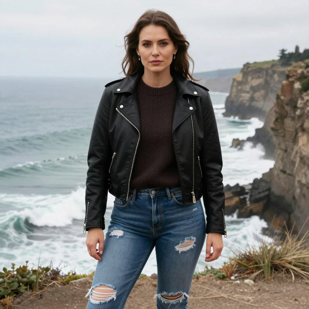 A Stocky woman, in a madhouse visual style, wearing a black leather biker jacket, dark brown knit sweater, and ripped skinny jeans, stands confidently at a Seaside cliff wedding, the ocean waves crashing behind her. Sexy. Pretty face and beutiful eyes