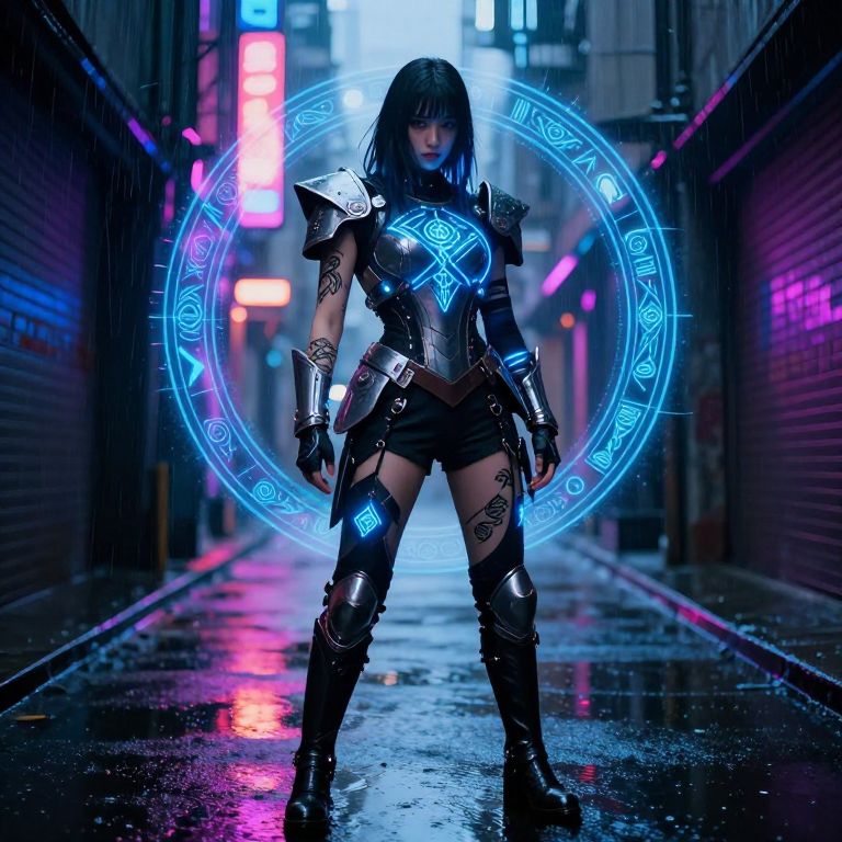 Photograph-style digital artwork of a dark-haired woman in a neon-lit, rain-soaked alley. She stands confidently, wearing black, shiny armor with glowing blue runes on her chest, arms, and thighs. Her outfit includes black shorts and knee-high boots. She has tattoos on her arms and legs. A bright blue, circular magical symbol glows behind her. The background features neon signs in pink and blue, and the alley's wet, reflective surface. The overall atmosphere is cyberpunk with a futuristic, mystical vibe.