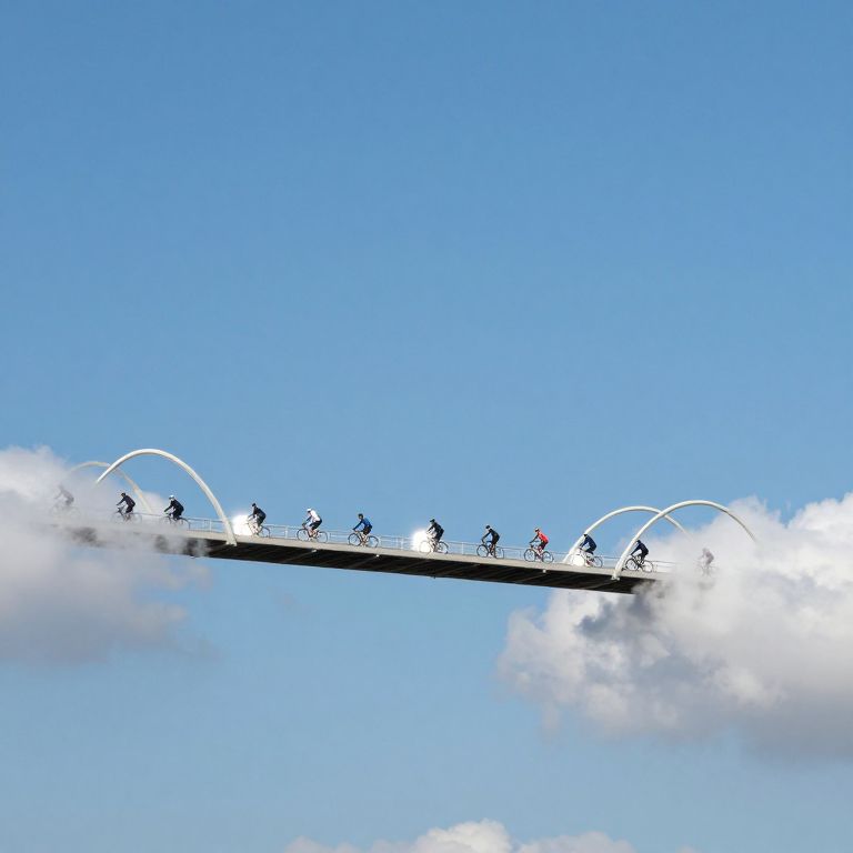 Photograph of a long, narrow bridge with a sleek, modern design, spanning horizontally across a bright blue sky. The bridge is slightly elevated and features white, curved arches at regular intervals. A line of cyclists, each wearing different colored helmets and casual cycling attire, rides along the bridge. The bridge is partially obscured by fluffy white clouds on the right and left sides. The cyclists are spaced evenly, creating a sense of motion and direction. The overall composition highlights the contrast between the bridge's modern architecture and the natural elements of the sky and clouds.