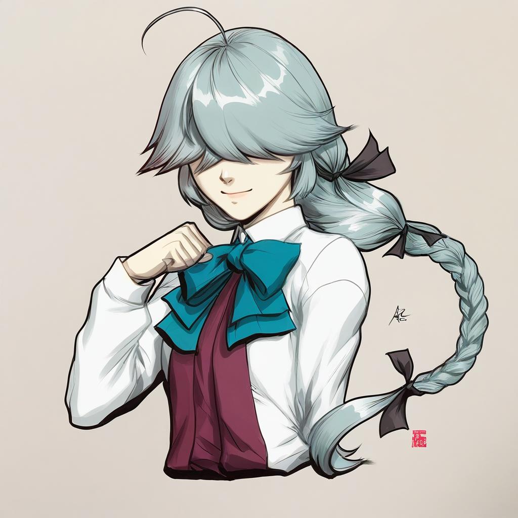 Digital illustration of a female anime character with long grey hair styled in a single braid adorned with black ribbons. The character has hair covering her eyes with an ahoge strand and wears a white school uniform shirt with long sleeves, a maroon vest, and a large teal bow at the collar. The image style is inspired by artist Stanley Lau.