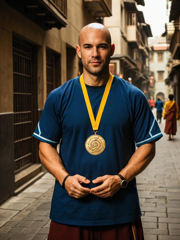Avatar The Last Airbender Adult, man with a medal in his hand standing in a street --sref 1387