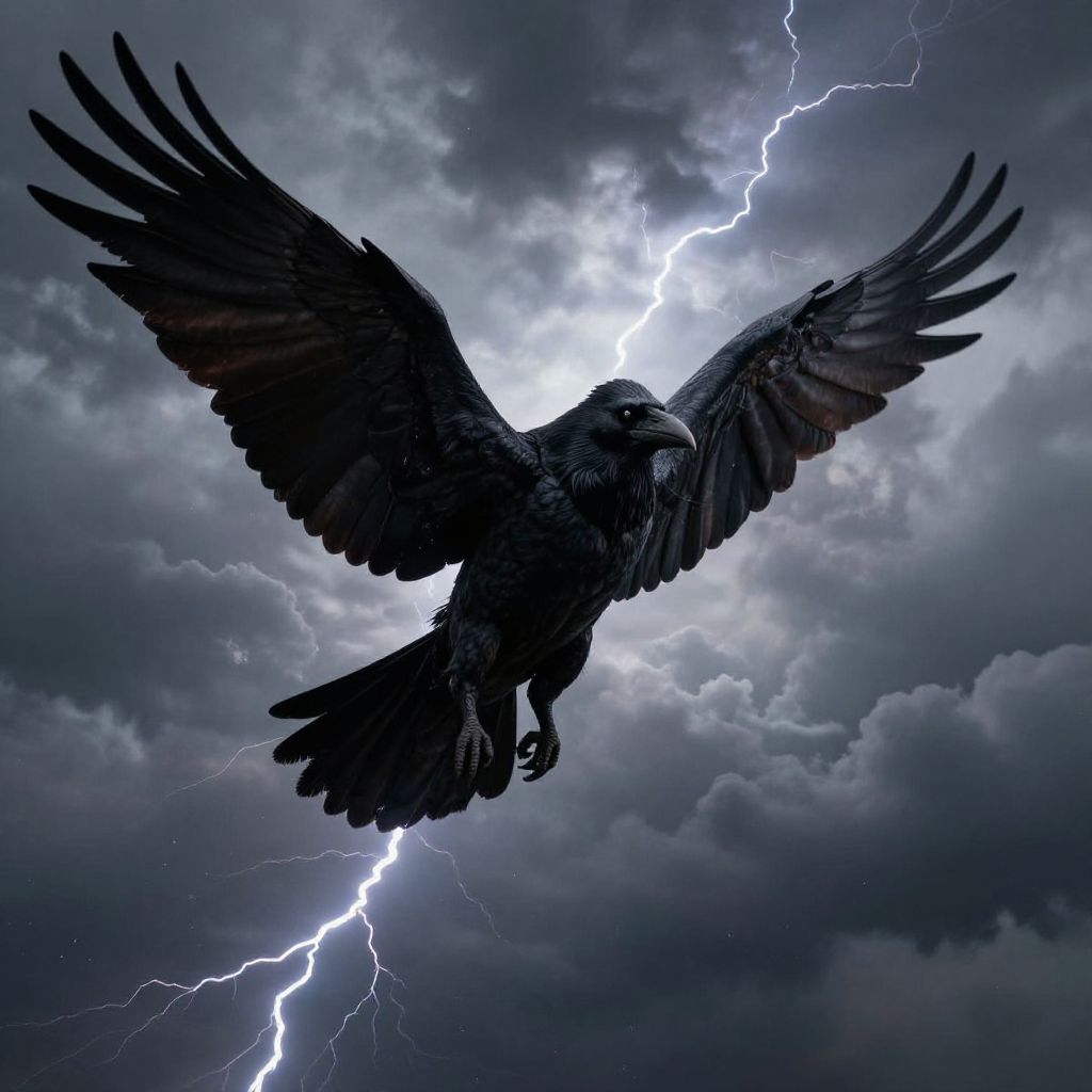 Photograph of a dark, fierce raven with wings spread wide flying against a stormy sky, illuminated by bright, jagged lightning.