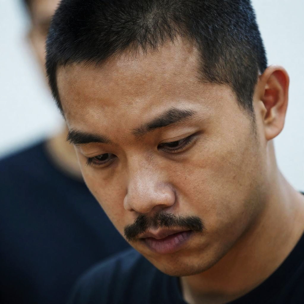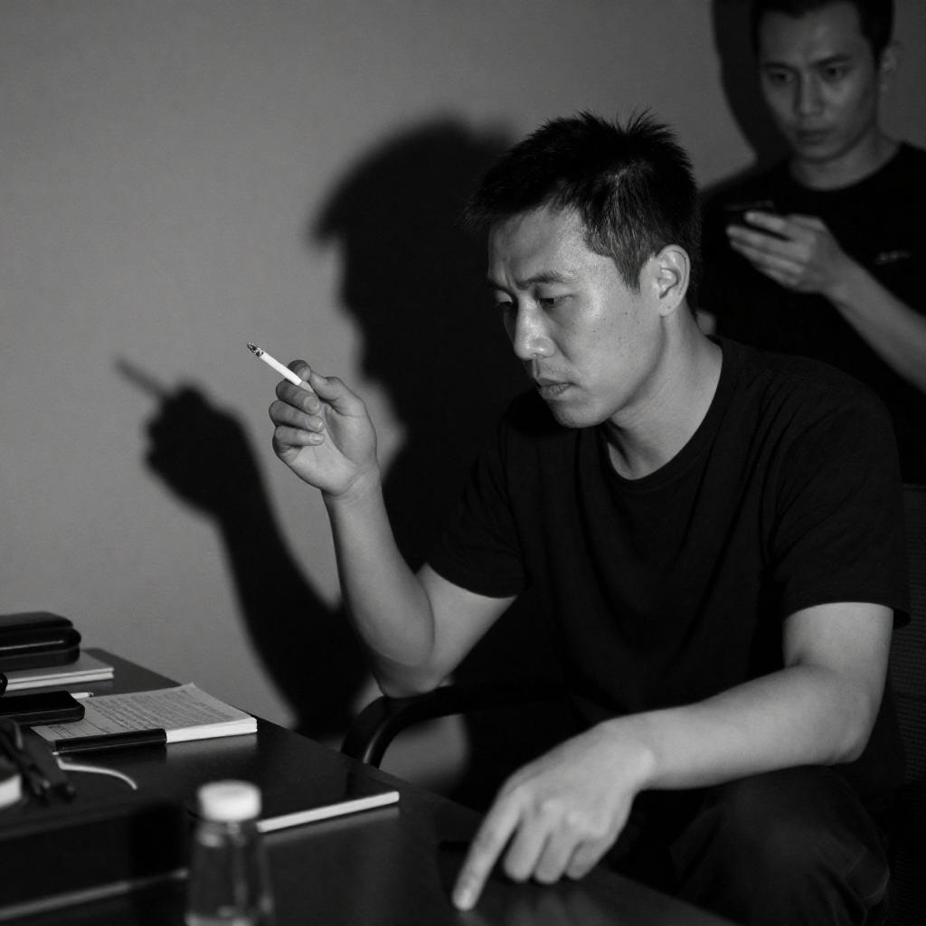 Black-and-white photograph of a man in a dark room, sitting at a desk, holding a cigarette, intense shadow play, second person in background, cluttered desk with objects, high contrast lighting. Two people, intense expressions.