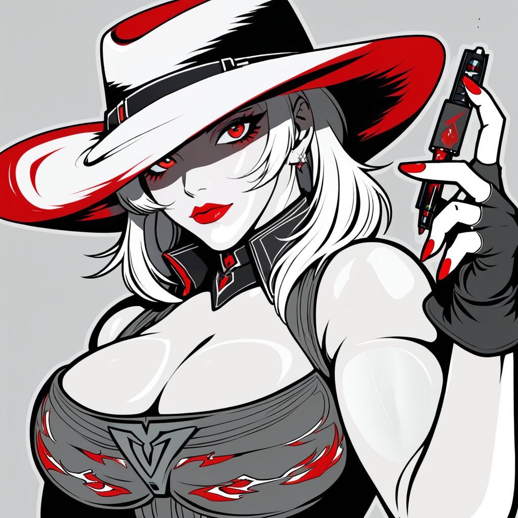 Ashe (overwatch), overwatch, 1girl, mole above mouth, red lips, lips, red eyes, white hair, short hair, medium hair, large breasts, medium breasts, cowboy hat, fingerless gloves, nail polish, lipstick, by artist sakakiba misogi, anime