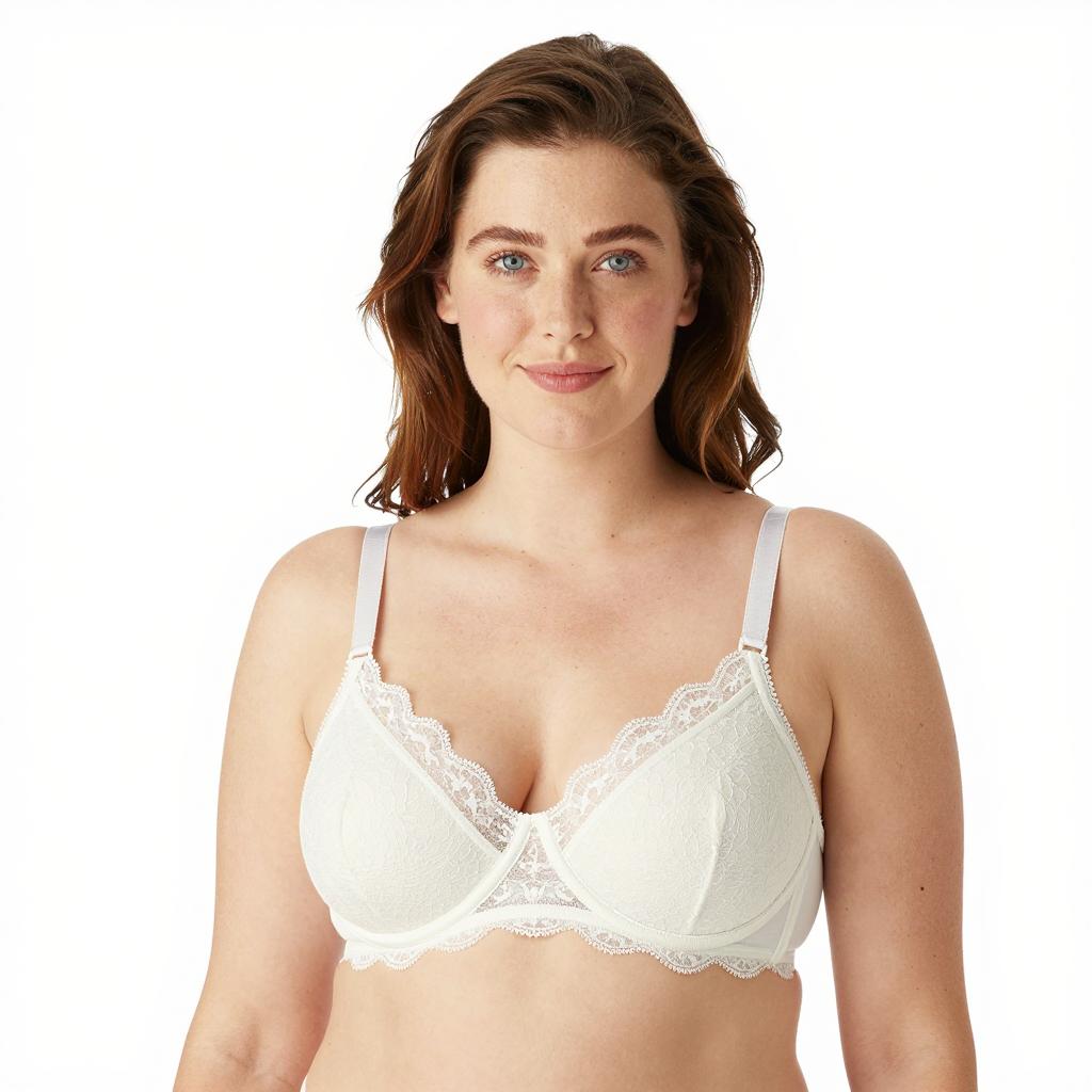Photograph of a woman with fair skin, brown hair, and blue eyes. She is wearing a white lace-trimmed bra, smiling slightly. Her arms are relaxed at her sides. She has a medium build and natural breast size. The background is plain white.