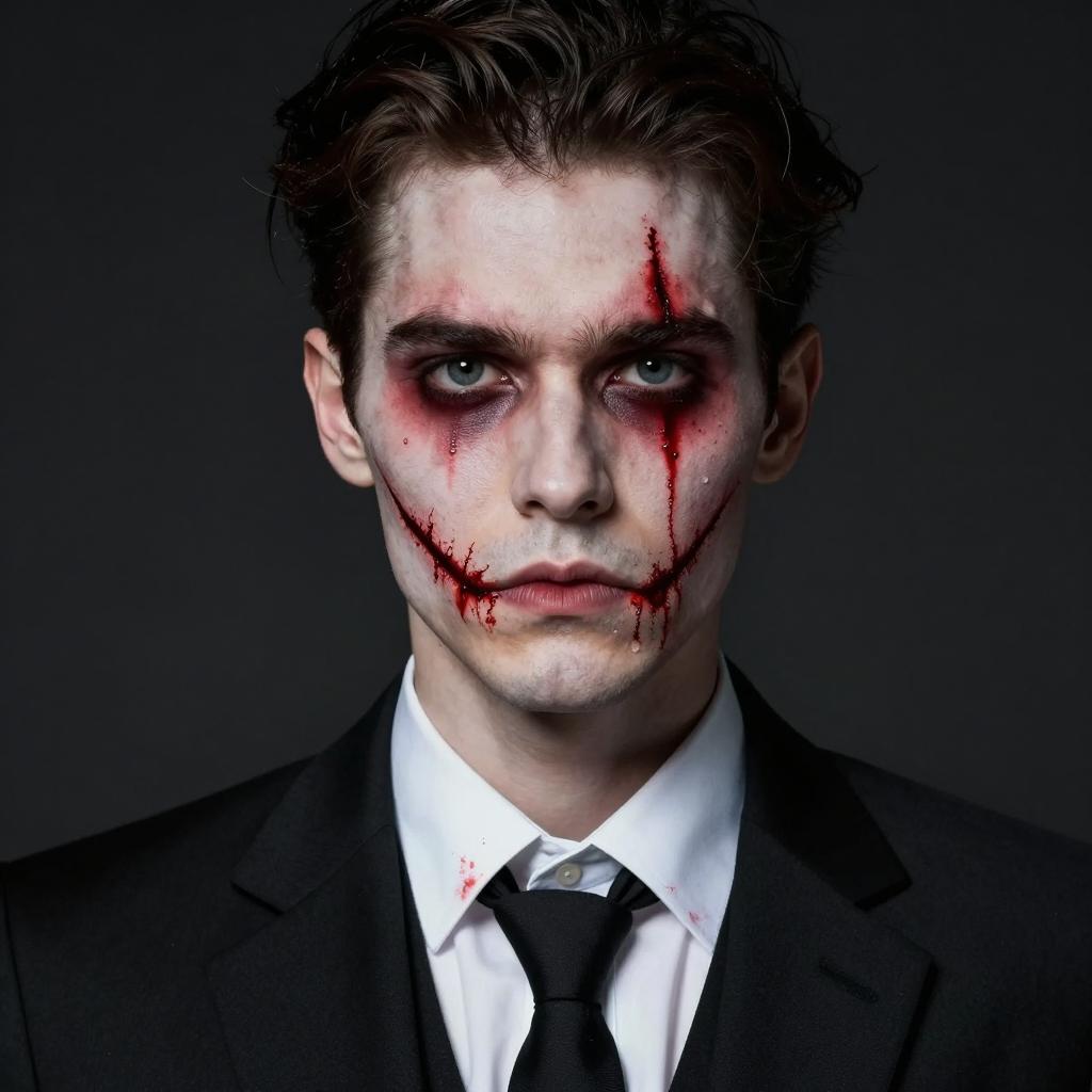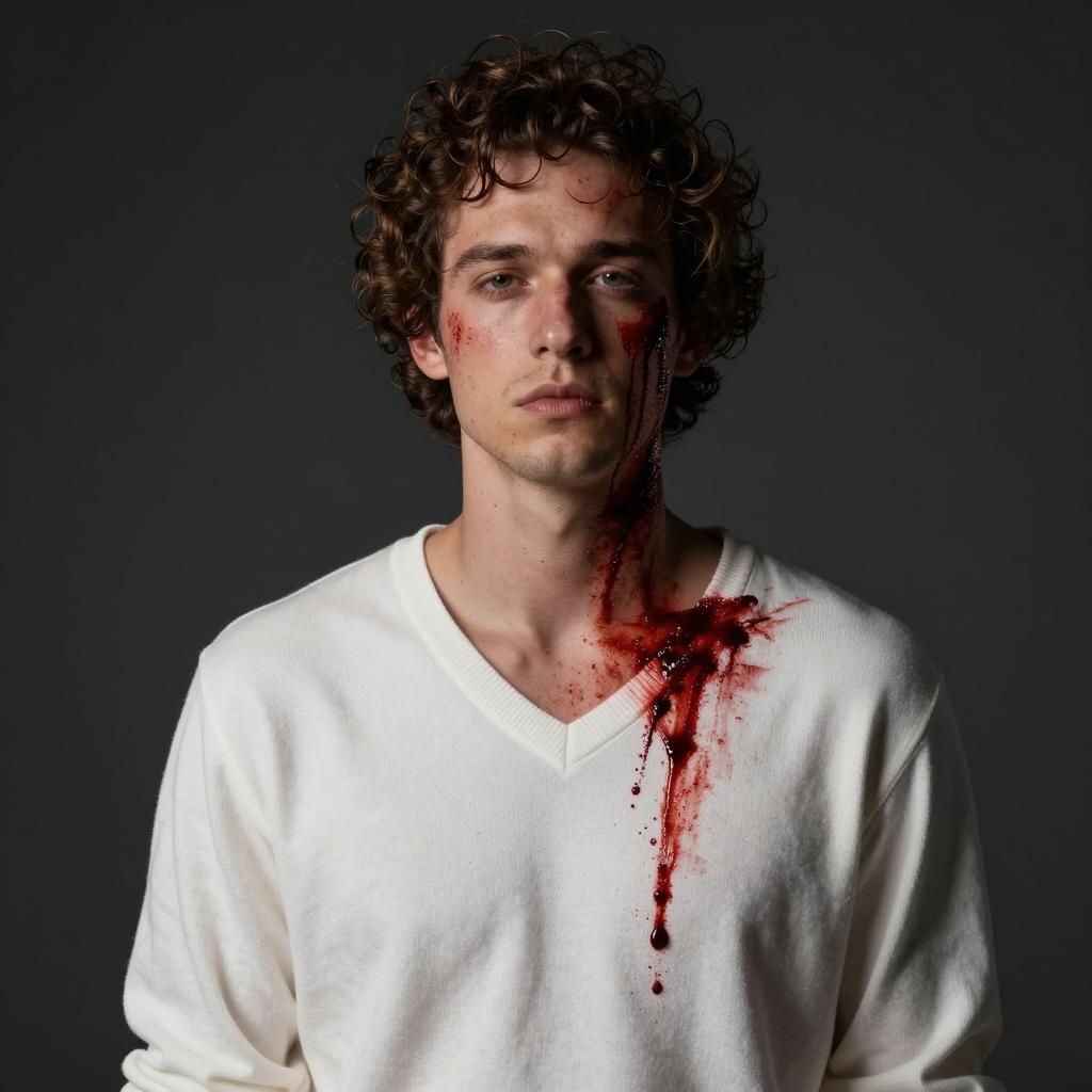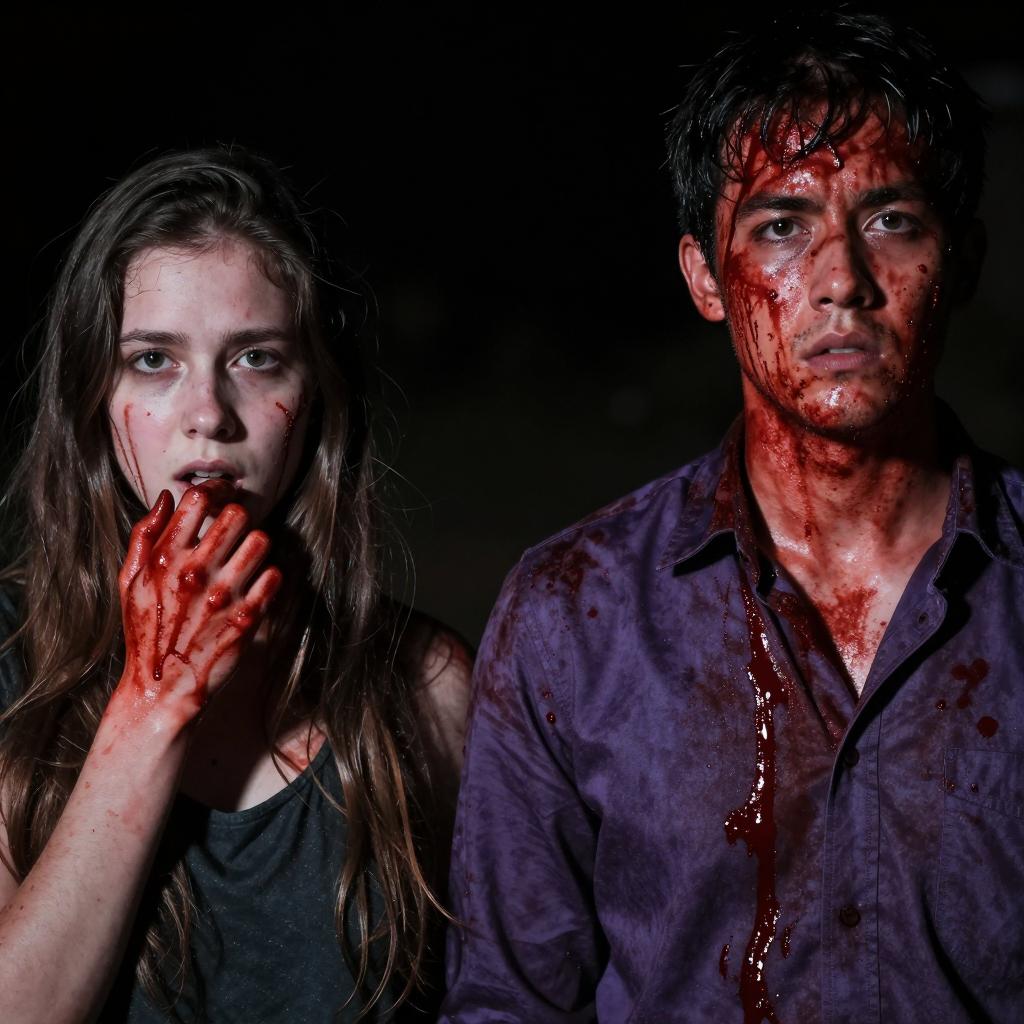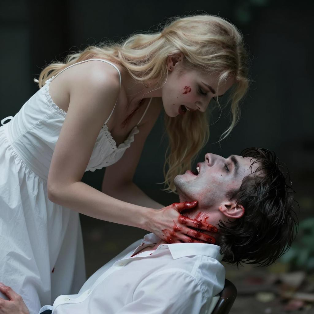 Blonde woman with blood on her face and hands, wearing a white strap dress, leans over a bleeding man with pale skin, dark hair, and a white shirt. She grips his neck with both hands, mouth open in a fierce expression. Blood stains his neck and her hands. Dark background. Two people. Intense facial expressions.