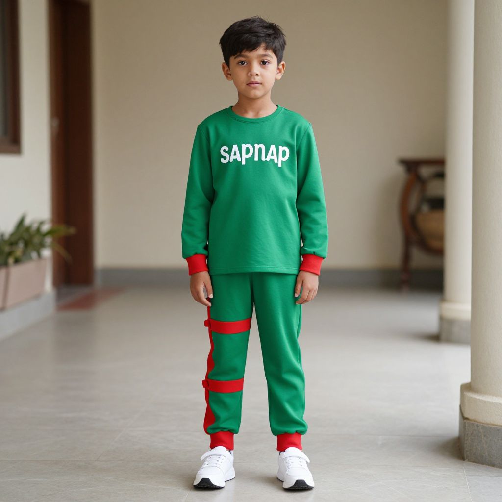 Photograph of a young boy with dark hair, wearing a green "SAPNA" sweatshirt and matching pants with red stripes, white socks,