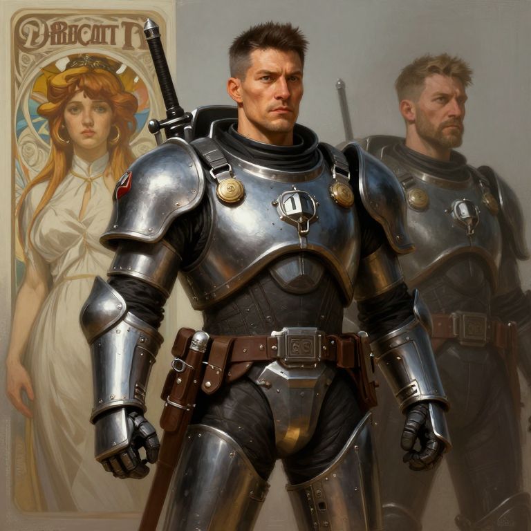 Digital artwork of two muscular, armored men in shiny steel armor, standing before a vintage painting of a serene woman. One man looks forward, the other