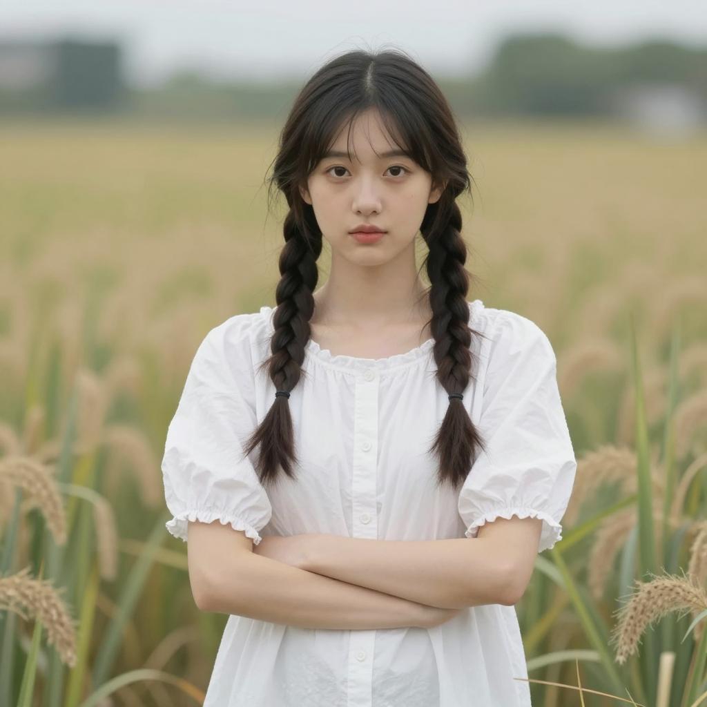 Young woman with fair skin, brown hair in a black bun, and glasses, wearing a white top, looks forward with a neutral expression. Background: blurry green grass, two men in the distance, one with a beard. Window with lace curtain on the left.