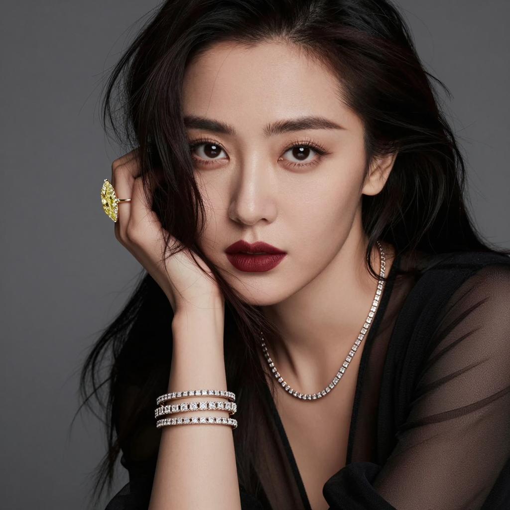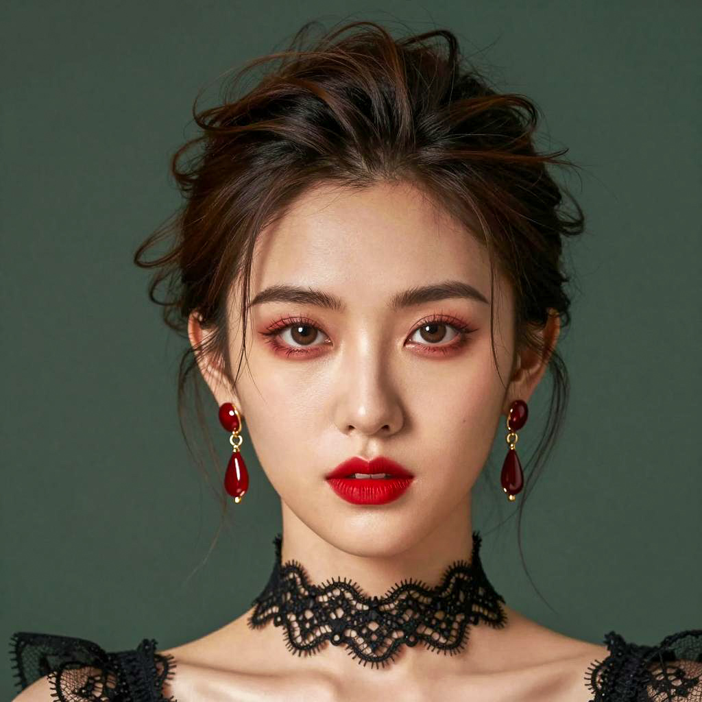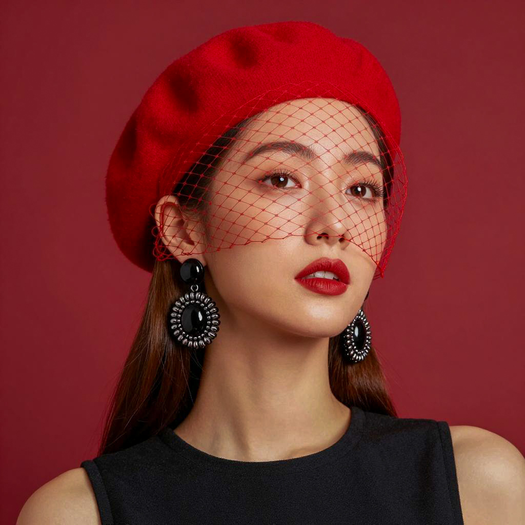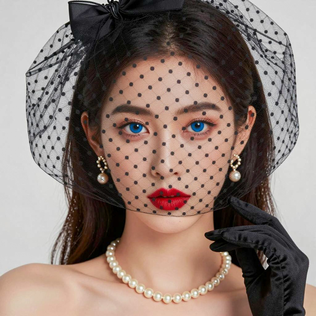 Photograph of a woman with fair skin and red lipstick. She wears a black, polka-dotted veil over her face, black gloves, pearl necklace, and earrings. Her blue eyes are partially visible under the veil. Dark, wavy hair peeks out from under the veil. She gazes directly at the camera with a neutral expression.