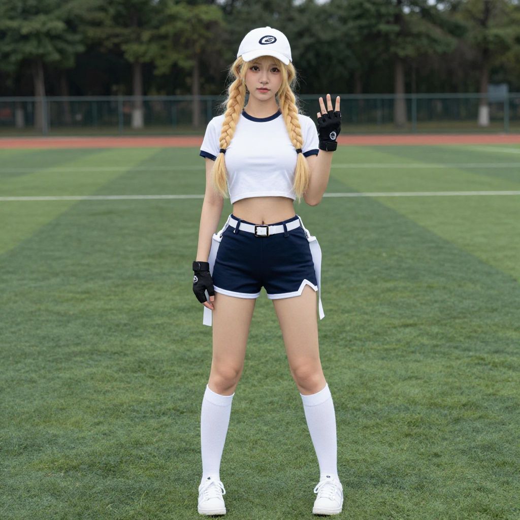 Photograph of a young blonde woman with long braided hair wearing a white baseball cap, white crop top, black and white baseball-style shorts, white knee-high socks, black gloves, and white sneakers. She stands on a green, well-manicured sports field, waving with her right hand. Her athletic build is accentuated by her outfit. The background features a fenced baseball diamond with trees beyond. The image has a slightly surreal, digitally enhanced quality, with vivid colors and sharp details.