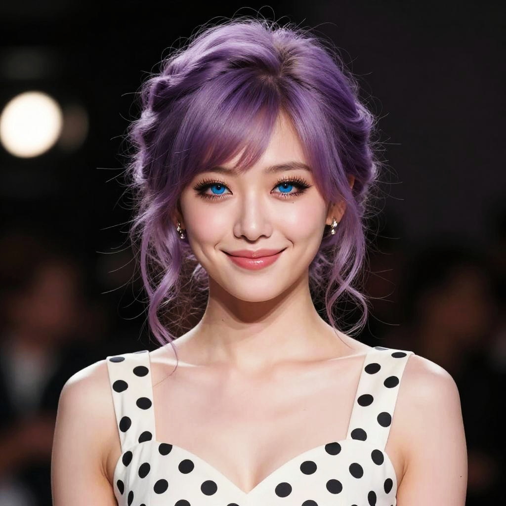Photograph of a young Asian woman with purple hair, blue eyes, and fair skin, wearing a white polka dot dress, smiling against a dark