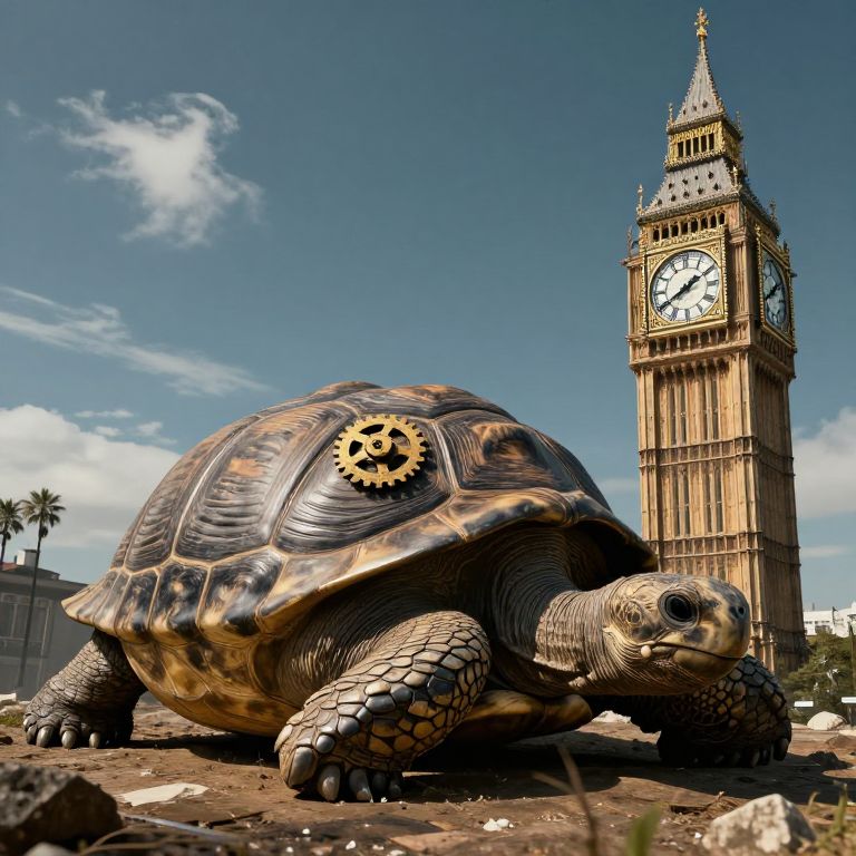 Photorealistic CGI: Giant tortoise with gears on shell in foreground, Big Ben clock tower in background, clear blue sky.