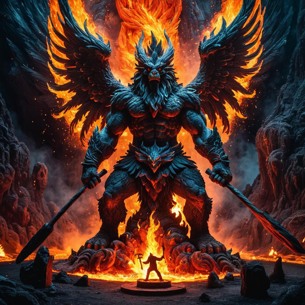 Surreal fantasy artwork of a troll sculptor carving an enormous fiery phoenix statue, in volcanic sanctuary filled with floating ember motes, with larger-than-life sculpting hammers, brilliant flame-like patterns, glowing dust swirling sharply, richly colorful and intense, highly imaginative and otherworldly