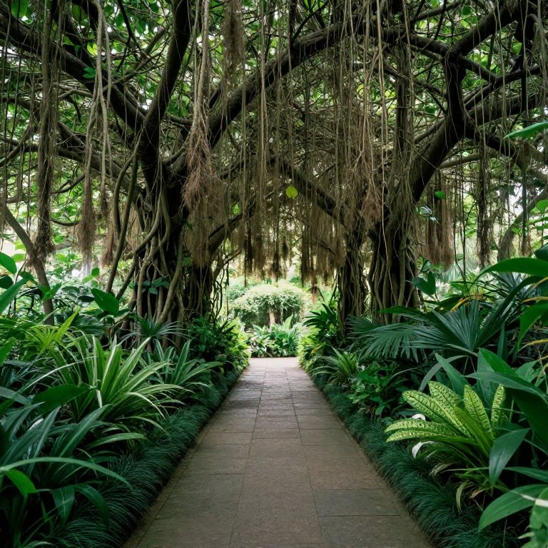 Photograph of a lush, tropical garden pathway. A narrow, stone-paved walkway runs through the center, flanked by dense, vibrant green foliage with large, pointed leaves. Towering, dark brown trees with thick, intertwining branches and hanging Spanish moss create a natural canopy overhead. Sunlight filters through the leaves, illuminating the greenery and creating a serene, shaded atmosphere. The background reveals a brighter, more open area with additional greenery. The overall scene is rich in texture and depth, evoking a peaceful, jungle-like environment.