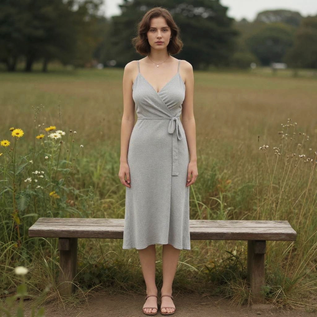 A hourglass woman in a vintage photo style, wearing a minimalist, heather gray wrap-style midi dress with a V-neckline and spaghetti straps, stands gracefully in a meadow with a wooden bench. She pairs her outfit with simple flat sandals and minimal jewelry, embodying effortless elegance amidst the natural beauty. Sexy. Pretty face and beаutiful eyes. Big breasts