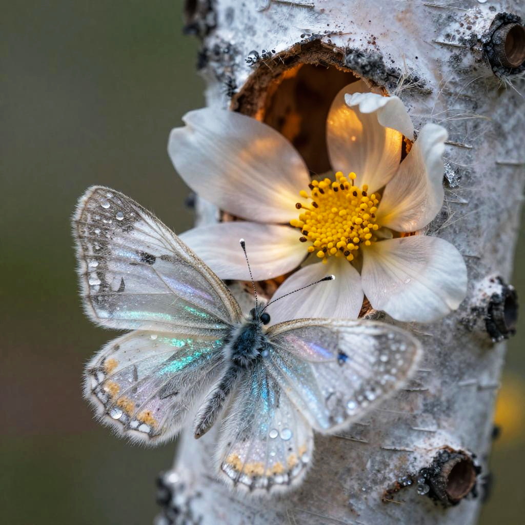 Celestial silver birch hollow filled with soft glowing pollen, endearing minute pollen-imbued butterfly wisp prancing among petals, a butterfly in the foreground formed from hairlike filaments of shimmering pollen dust, dewdrops glitter, intricate textures, iridescent colors, macro realism, magical realism, hyperrealistic, volumetric light, soft bokeh, tactile details, storybook yet believable, 8k clarity