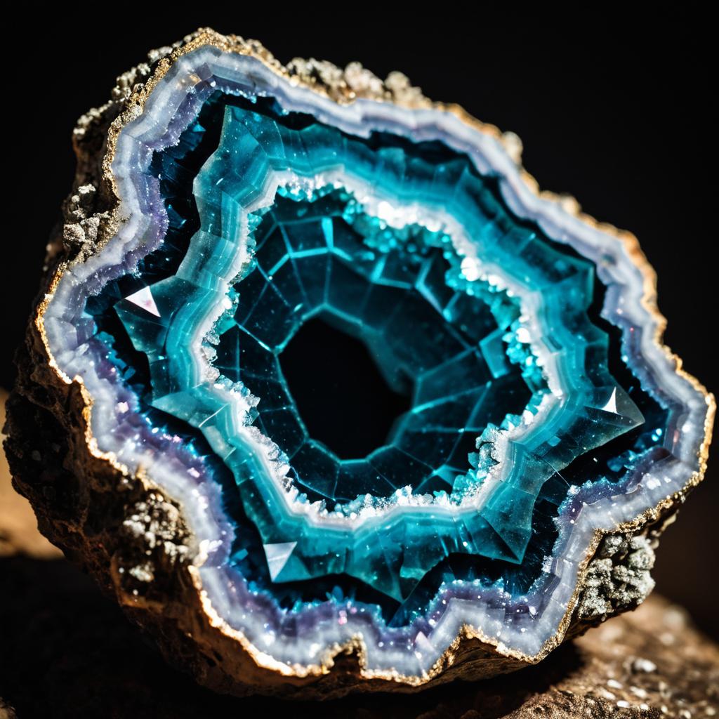 Macro lens photo of a glowing crystal geode, high resolution, realism, taken with a Nikon D850 and 105mm lens, soft natural lighting.